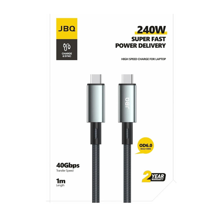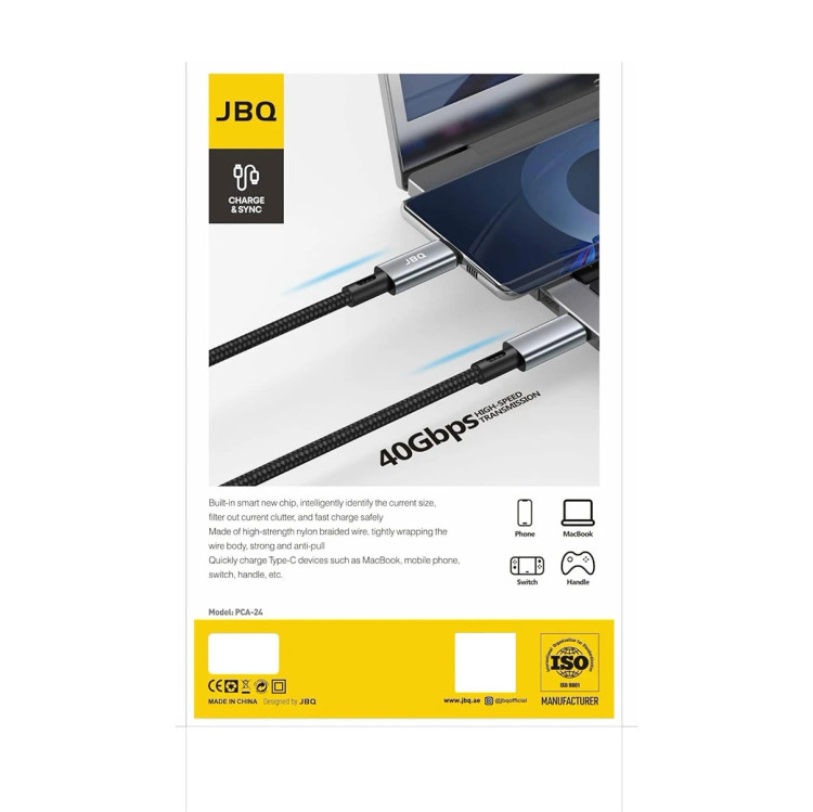 کابل تایپ سی سوپر فست شارژ JBQ مدل PCA-24 این کابل دارای توان خروجی 240 وات می باشد. جنس این کابل از الیاف نایلونی بهم بافته شده است و سرعت انتقال اطلاعات در این کابل TYPE-C جی بی کیو برابر 40 گیگابیت بر ثانیه است از این جهت برای شارژ و انتقال اطلاعات دستگاه هایی مانند مک بوک، موبایل و همه دستگاه هایی که دارای پورت تایپ سی هستند بسیار مناسب می باشد. همچنین از این کابل برای شارژ تبلت نیز می توانید استفاده کنید. این کابل دارای یک متر طول است.