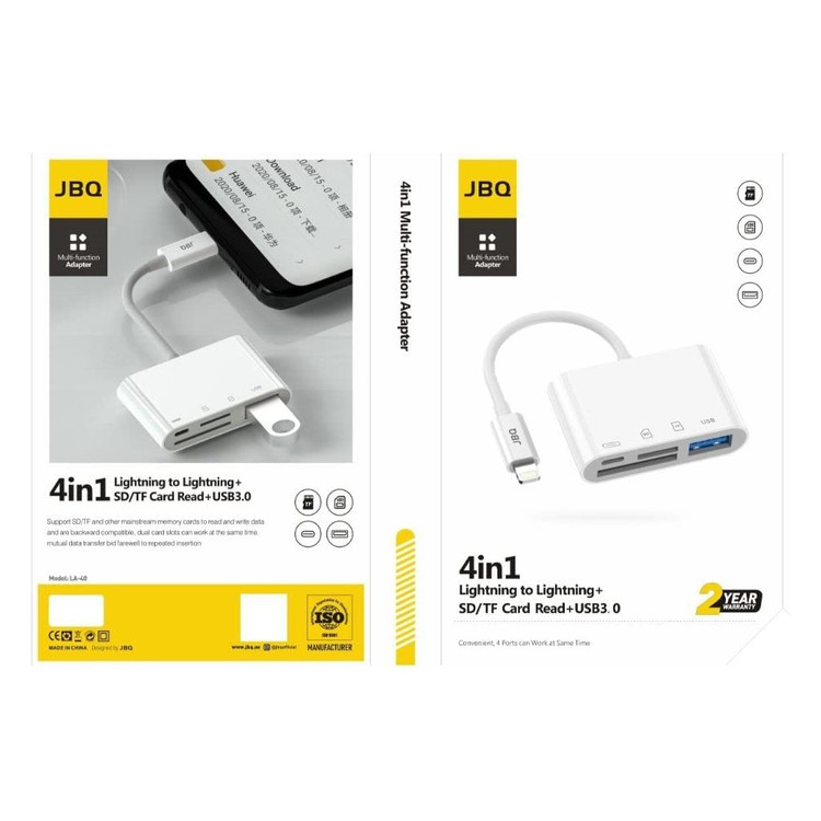 مبدل JBQ LA-40 با پورتهای Lightning دوگانه، USB 3.0 و کارتخوان SD/TF است. این محصول با قابلیت شارژ همزمان و انتقال سریع داده، برای دستگاههای اپل طراحی شده است.