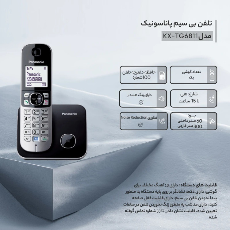 تلفن بیسیم پاناسونیک مدل «KX-TG6811» شاید تلفنی رده متوسط و فاقد منشی تلفنی باشد، اما کیفیت صدایی فوقالعاده تولید میکند و از چندین قابلیت تکنولوژی «DECT» سود میبرد. همچنین گوشی بیسیم شیک آن دارای صفحهنمایش تکرنگ «Monochrome» بزرگی است که کارکردن با دستگاه را بسیار آسان میکند. کیفیت صدا در این تلفن تحسینبرانگیز است؛ بوسیله فناوری Noise Reduction صداهای مزاحم محیط برای رسیدن به کیفیت عالی، کاهش یافته و حتی حذف میشوند. قابلیت ذخیرهسازی 100 مخاطب در دفترچه تلفن و 10 آهنگ مختلف برای گوشی و قابلیت نشان دادن تا 50 شماره تماس گرفته شده از دیگر ویژگیهای این تلفن بیسیم به شمار میروند. اگر قصد خرید تلفنی بیسیم با قیمتی مناسب دارید، «KX-TG6811» انتخابی ایدئال است.
