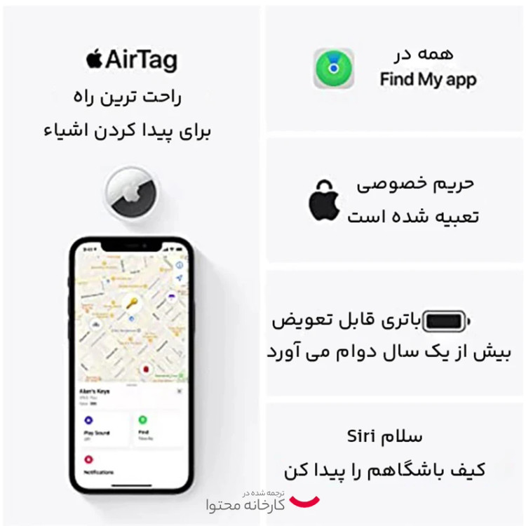 کمپانی اپل اینبار هم با معرفی محصولی جدید توجهات کاربران بسیاری را به سوی خود جلب کرد. تگ ردیاب هوشمند اپل مدل AirTag یکی از تولیدات جدید و کاربردی این کمپانی است و یکی از بهترین گزینهها برای افرادی محسوب میشود که وسایل شخصی نظیر کیف پول، جا سوئیچی، کلیدها و یا کیف دستی خود را گم میکنند و یا برای پیدا کردن آن عجله دارند. این تگ ردیاب هوشمند توسط جی پی اس گوشی قابل ردیابی است و برای استفاده از آن کافی است تگ را داخل یکی از جیبهای کیف دستی یا کیف پولتان قرار دهید و سپس توسط ردیاب گوشی مگان آن را پیدا کنید. پیدا کردن این تگ توسط دستیار هوشمند گوشیهای اپل یعنی siri هم امکان پذیر خواهد بود و میتوانید بعد از انجام تنظیمات لازم از او بخواهید که مکان دقیق تگ ردیاب را به شما نمایش دهد. این محصول دارای گواهینامهی IP67 است و این به معنای آن است که ایرتگ در برابر گرد و غبار و آب تا عمق 1 متر و برای مدت 30 دقیقه مقاوم خواهد بود. این محصول با گوشیهای برند اپل از نسخهی 11 به بعد سازگار است و از بلوتوث نسخهی 5.0 پشتیبانی میکند.