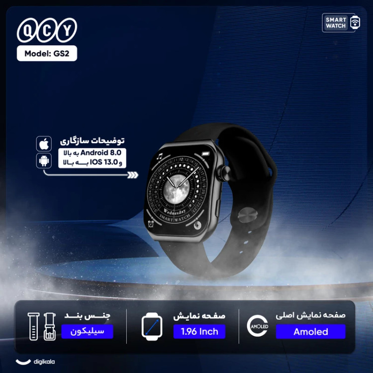 ساعت هوشمند کیو سی وای مدل GS2 با طراحی مستطیلشکل و امکانات پیشرفته، گزینهای ایدهآل برای کاربران روزمره و ورزشکاران است. بدنه این ساعت از جنس آلیاژ روی ساخته شده و بند سیلیکونی سبک آن، ترکیبی از دوام و راحتی را ارائه میدهد. بهصورت کلی طراحی این ساعت به نحوی است که با هر استایلی هماهنگ میشود. صفحهنمایش امولد ۱.۹۶ اینچی با رزولوشن ۴۱۰×۵۰۲، تصاویری شفاف در حد برند QCY ارائه و همچنین تراکم پیکسلی ۳۳۲ و نرخ نوسازی 60 هرتز آن، جزئیات را بهوضوح نمایش میدهد. این ساعت با سیستمعاملهای Android نسخه ۸.۰ به بالا و iOS نسخه ۱۳.۰ به بالا سازگار است. از حسگرها و قابلیتهایی که این ساعت دارد میتوان به شمارنده ضربان قلب، سنجش اکسیژن خون، فشارسنج و گامشمار اشاره کرد که اطلاعات دقیقی از سلامتی و فعالیتهای شما ارائه میدهند. باتری لیتیوم پلیمری با ظرفیت ۲۶۰ میلیآمپر ساعت، باعث شده تا بدون نیاز به شارژ مکرر بتوان در طول روز از آن استفاده کرد. گواهی IPX7 ساعت هوشمند کیو سی وای مدل GS2 هم آن را در برابر نفوذ آب مقاوم میسازد به صورتی که میتوان از آن بدون نگرانی در فعالیتهای ورزشی استفاده کرد. ساعت هوشمند QCY GS2 با ترکیب طراحی، امکانات و عملکرد قابلاعتماد، انتخابی عالی برای افرادی است که به دنبال دستگاهی کاربردی و زیبا هستند.